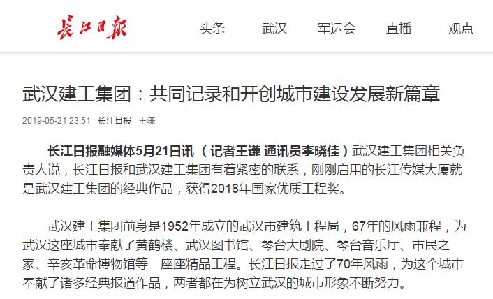 長(zhǎng)江日?qǐng)?bào)融媒體5月21日訊 (記者王謙 通訊員李曉佳)武漢建工集團(tuán)相關(guān)負(fù)責(zé)人說(shuō),長(zhǎng)江日?qǐng)?bào)和武漢建工集團(tuán)有著緊密的聯(lián)系,剛剛啟用的長(zhǎng)江傳媒大廈就是武漢建工集團(tuán)的經(jīng)典作品,獲得2018年國(guó)家優(yōu)質(zhì)工程獎(jiǎng)。