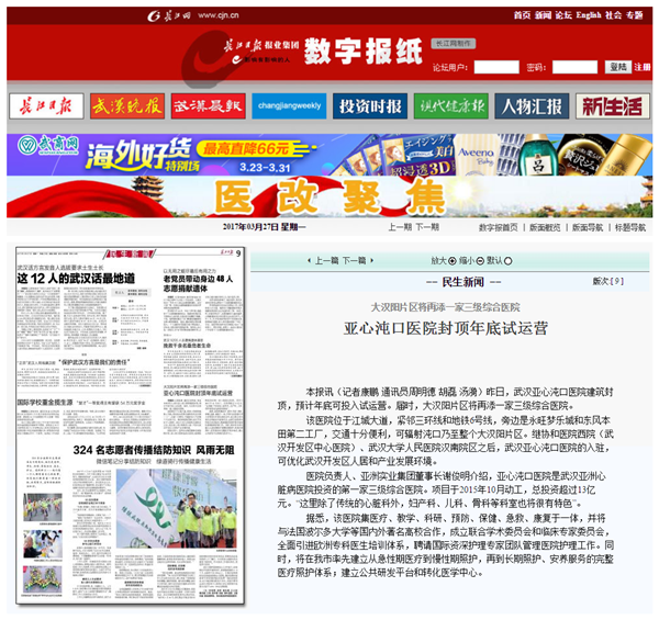 大漢陽片區(qū)將再添一家三級綜合醫(yī)院,亞心沌口醫(yī)院封頂年底試運營!(載《長江日報》2017年3月27日第九版)
