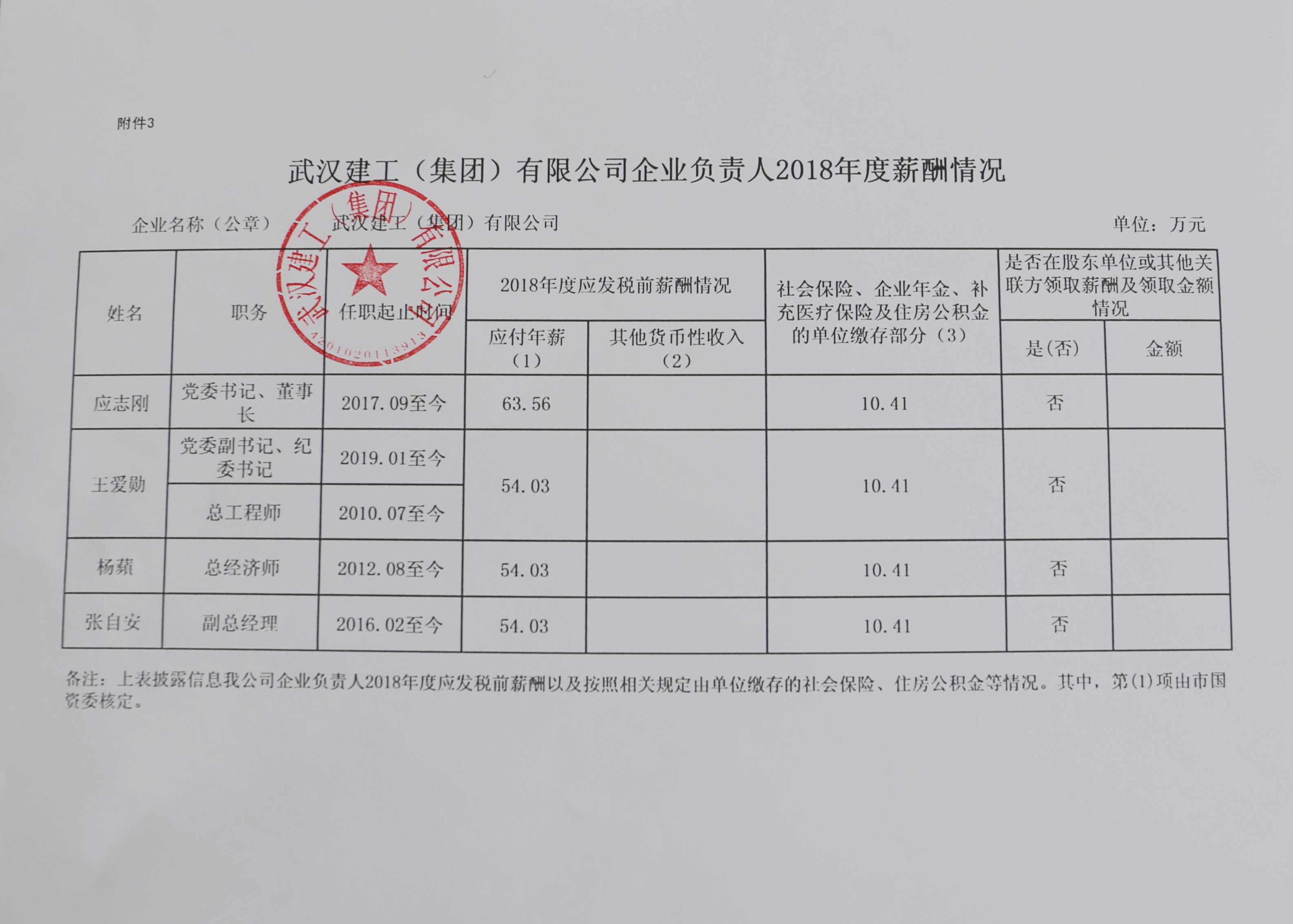 武漢建工(集團)有限公司企業(yè)負責人2018年度薪酬情況